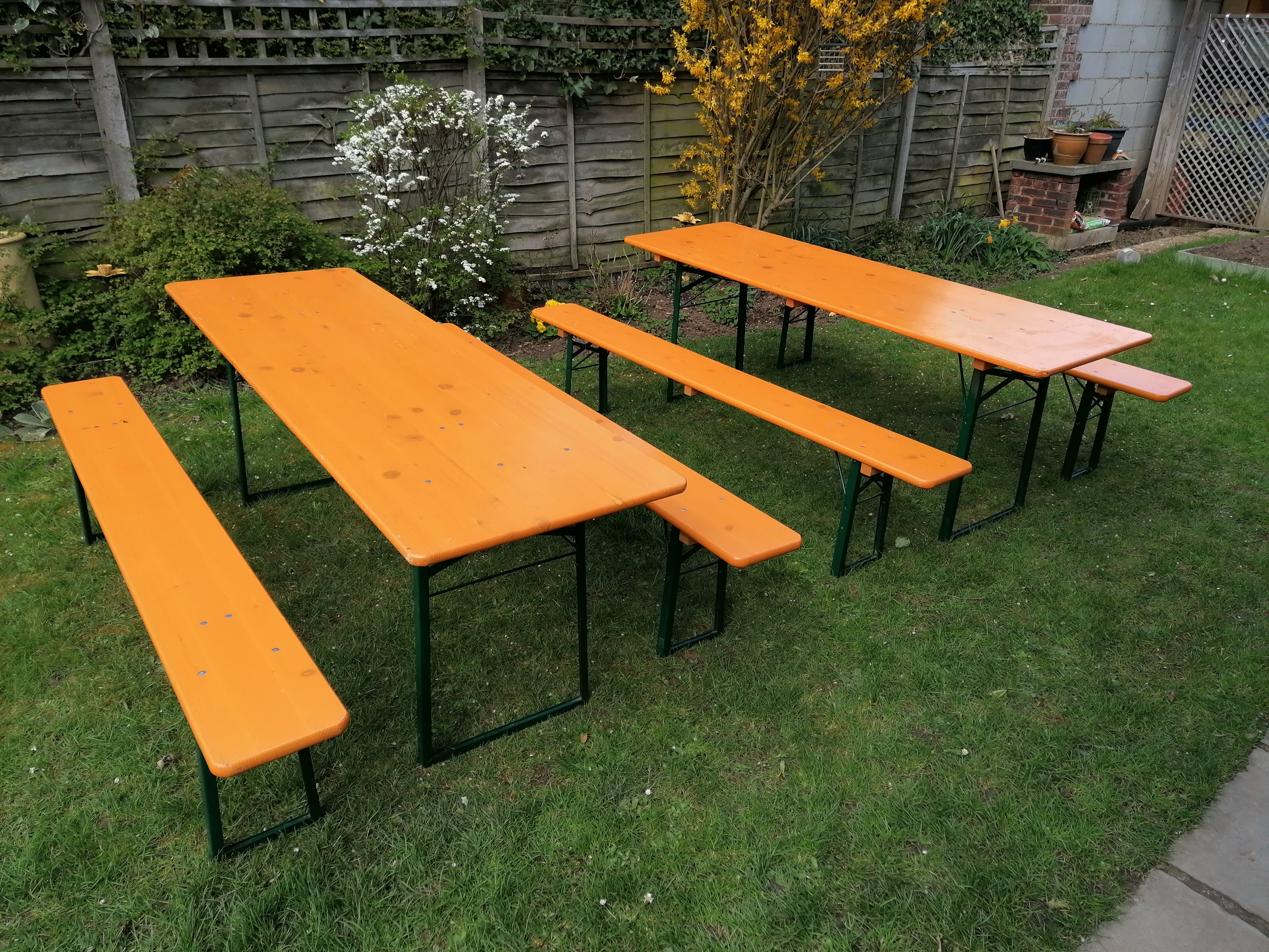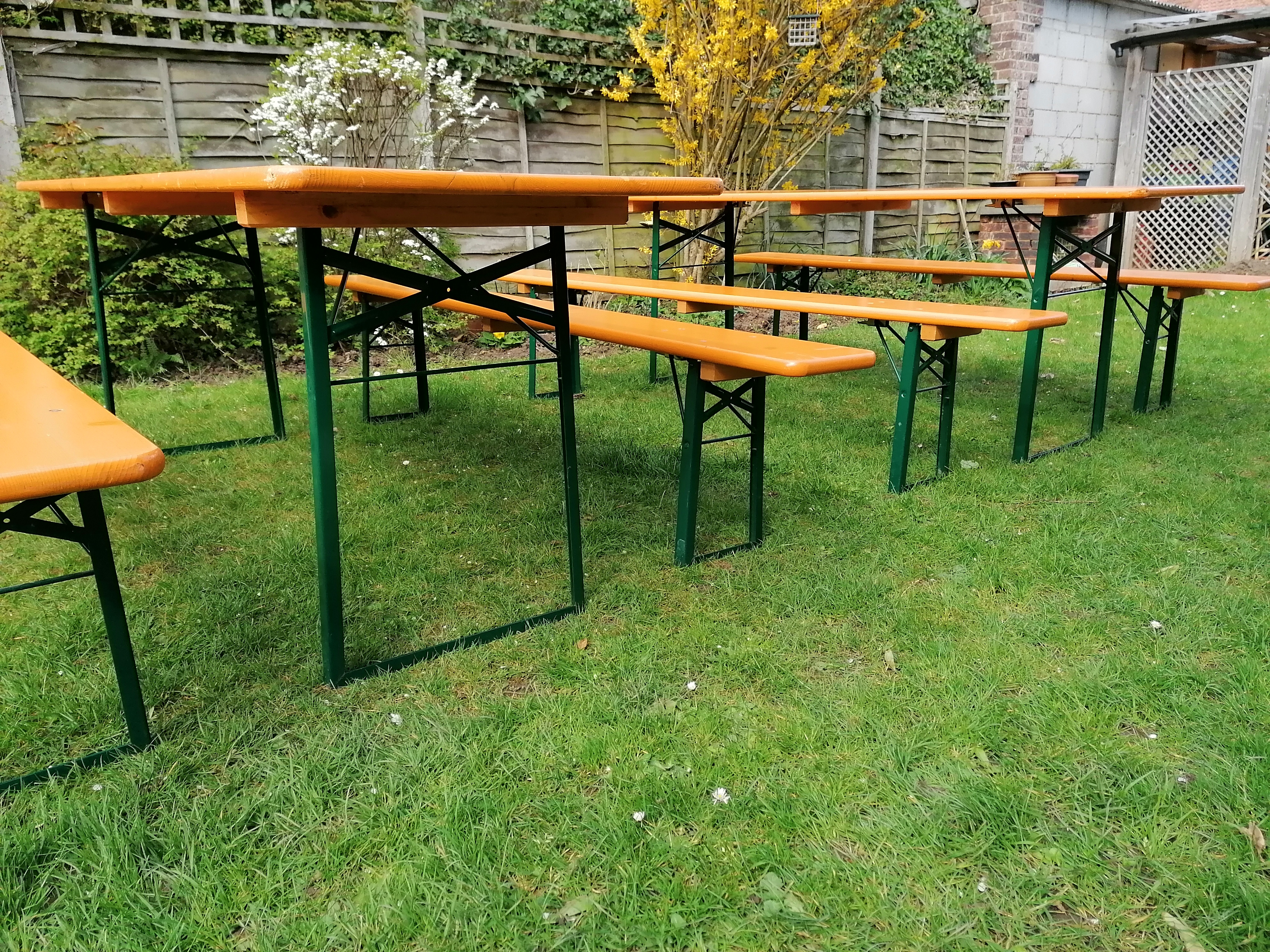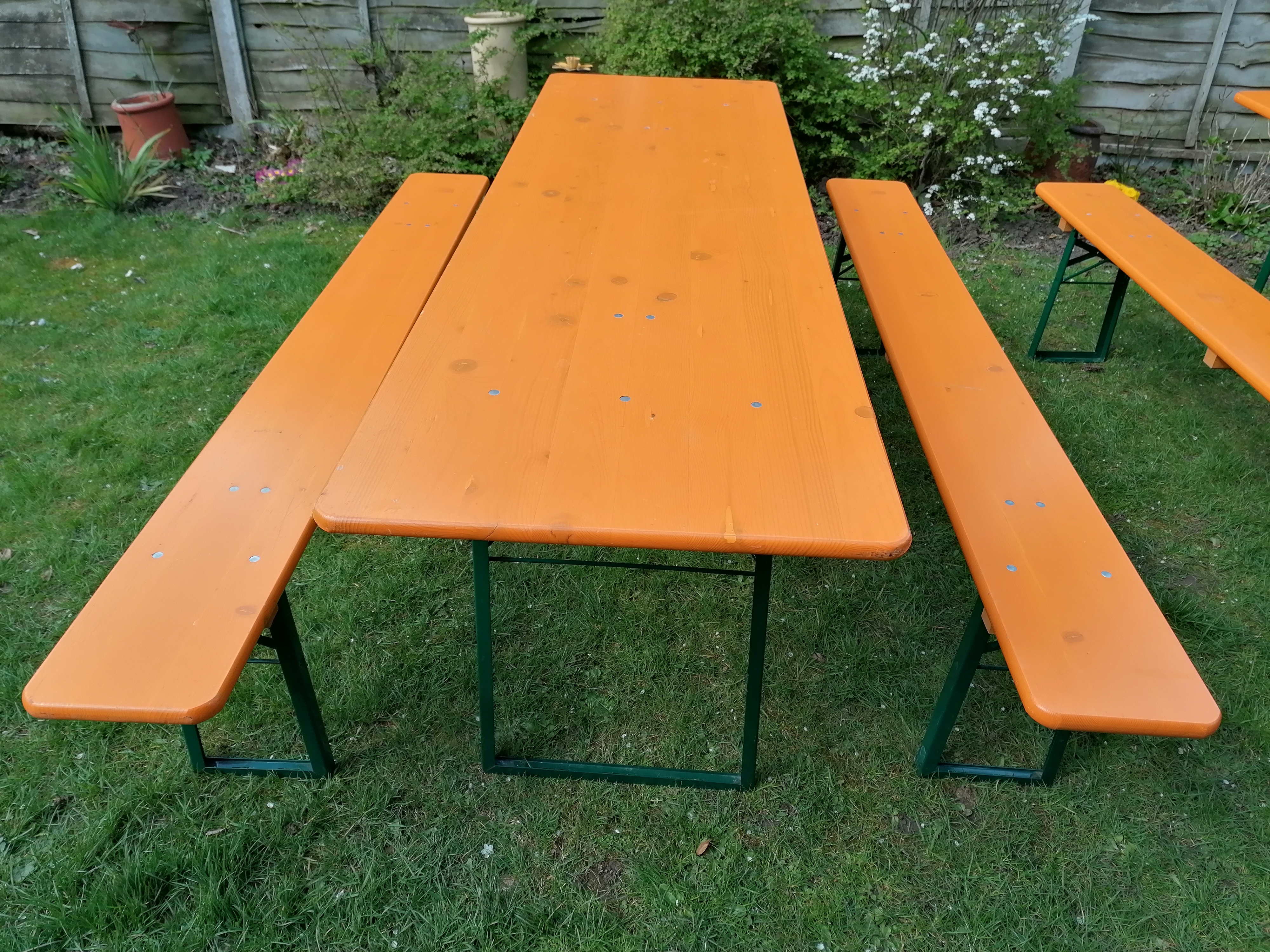 These beer table and bench sets have been used for many seasons at German beer garden festivals and have general wear and tear including scratches, bashes etc. consistent with regular use and handling. All sets are structurally sound and ready to use.