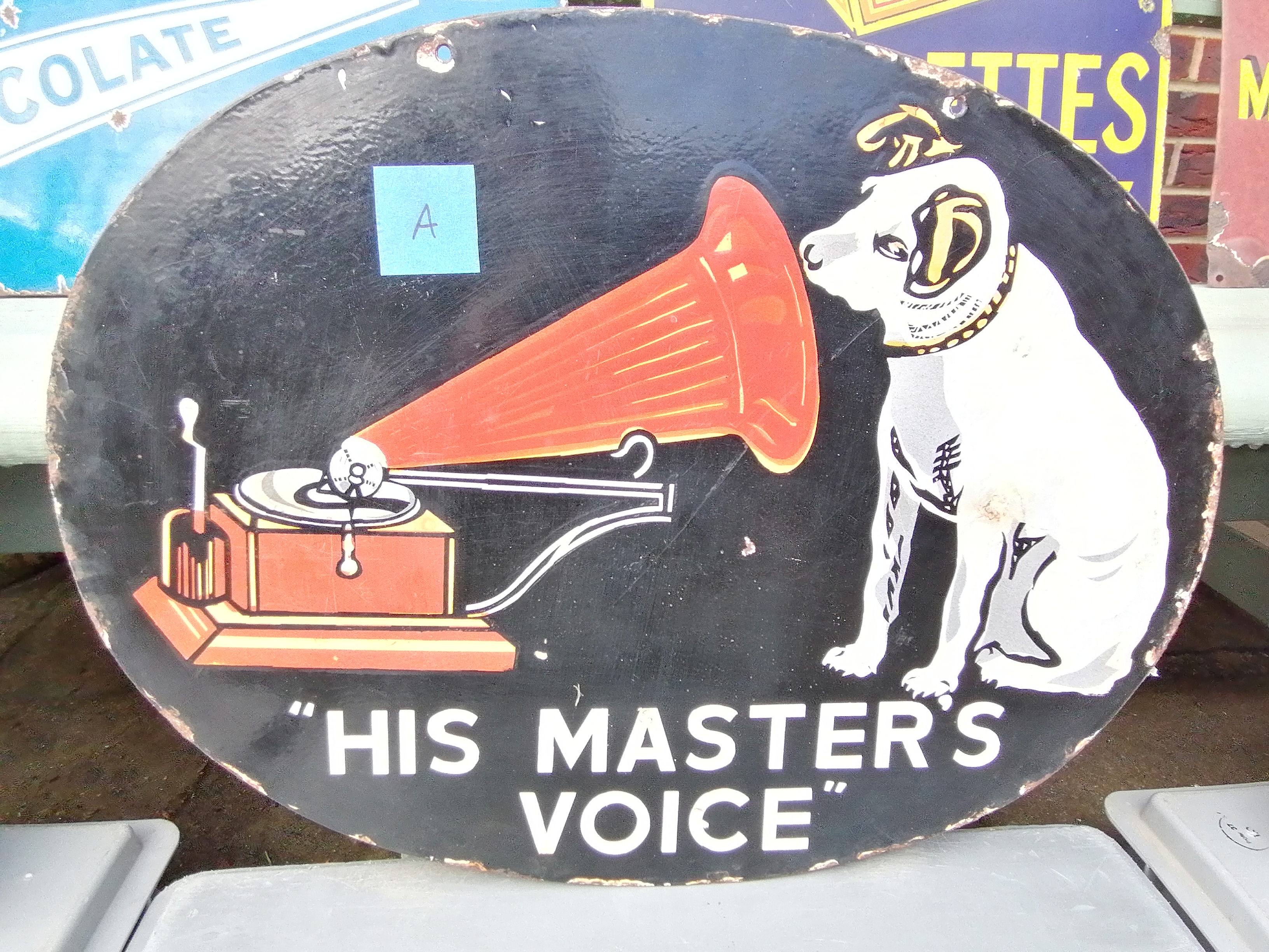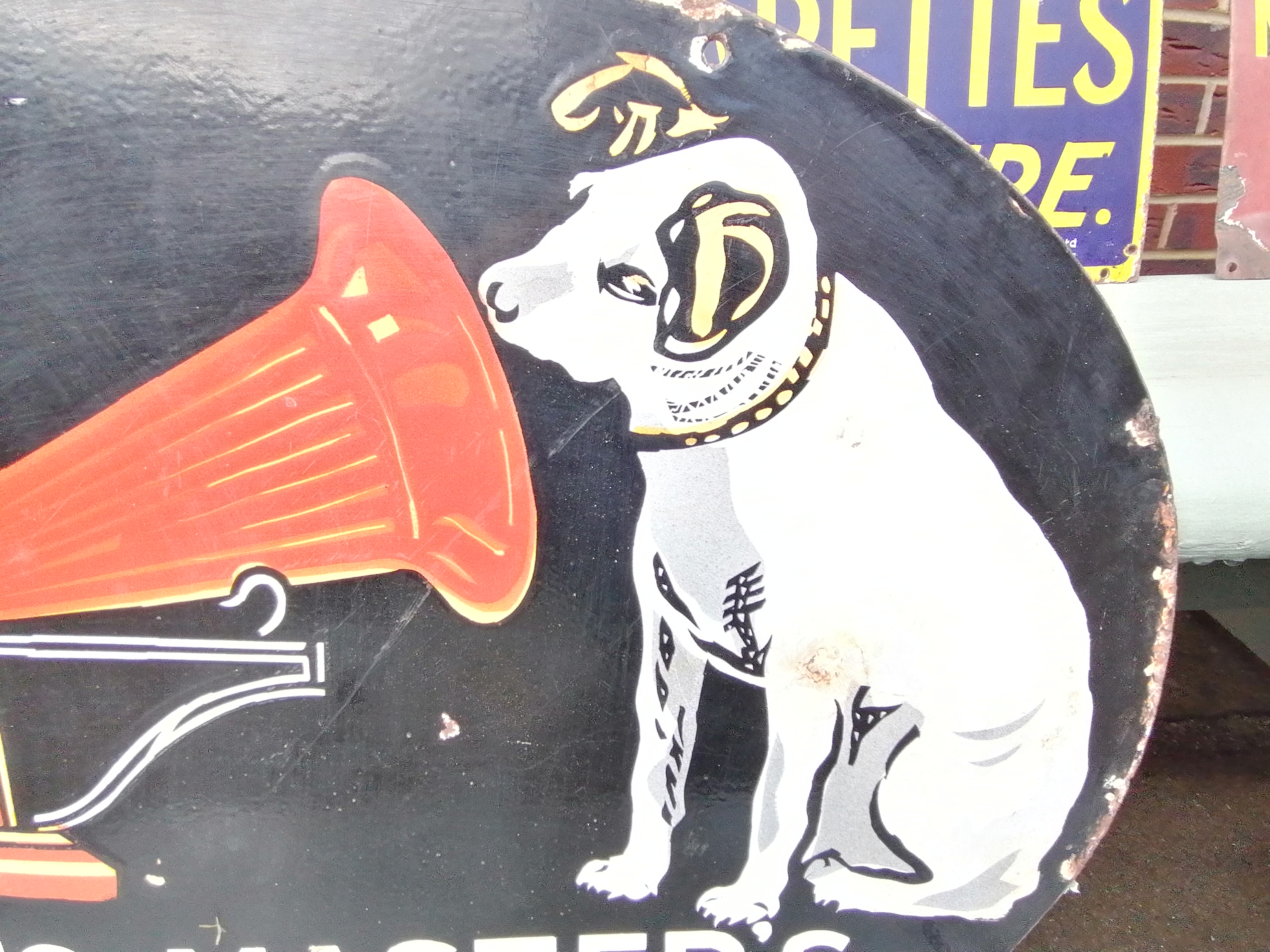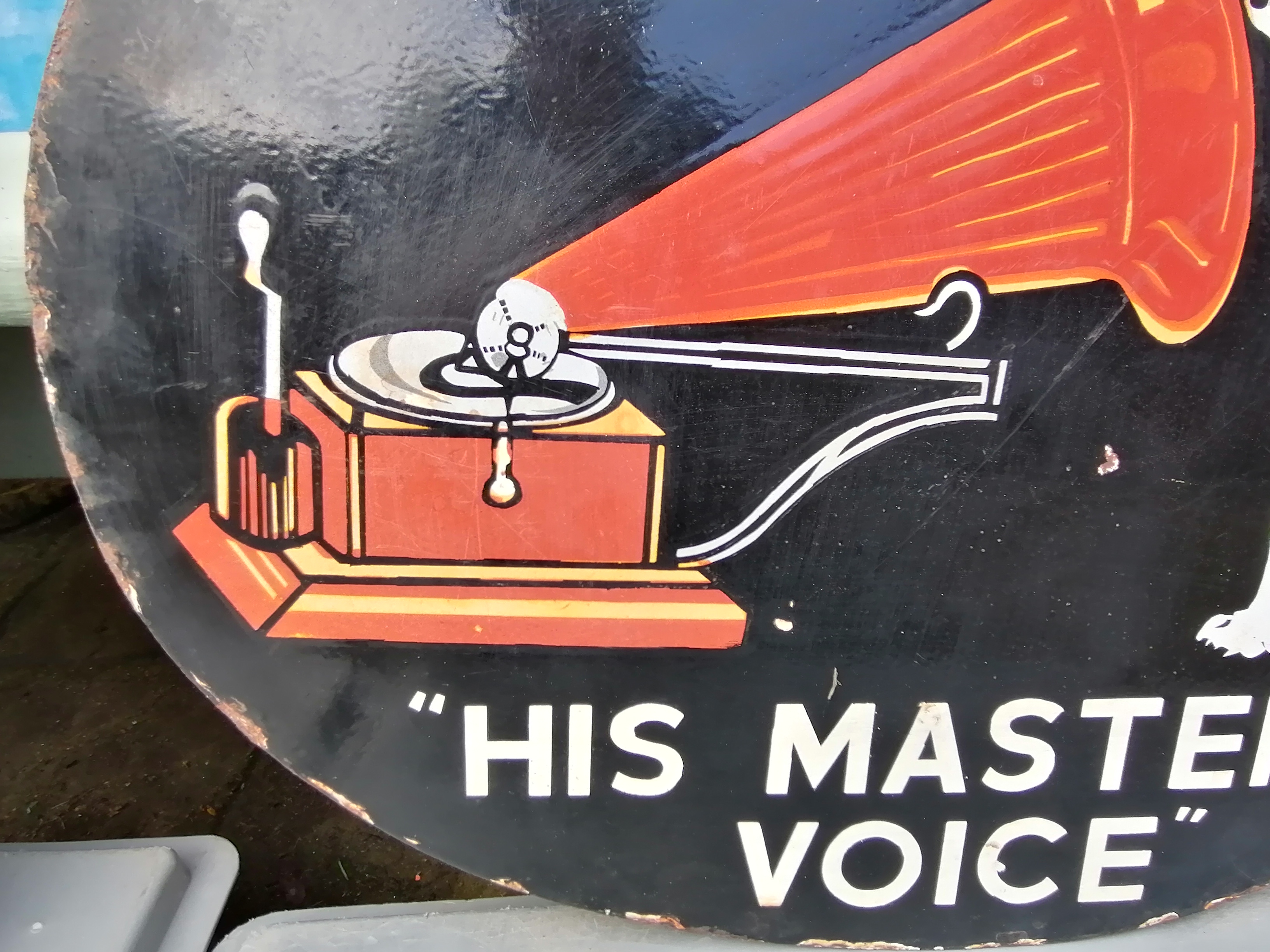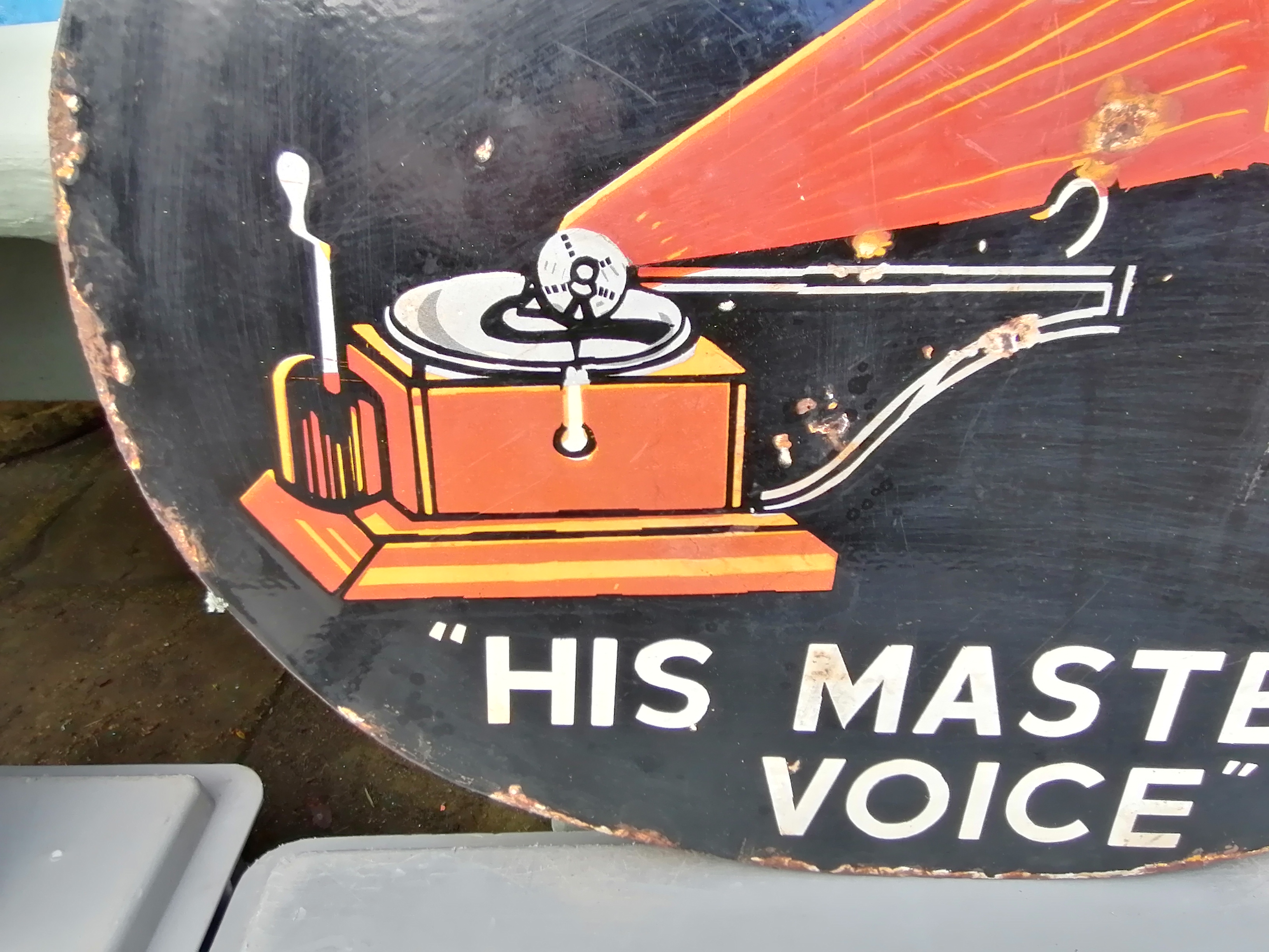 His Masters Voice, antique enamel double sided, shop advertising sign