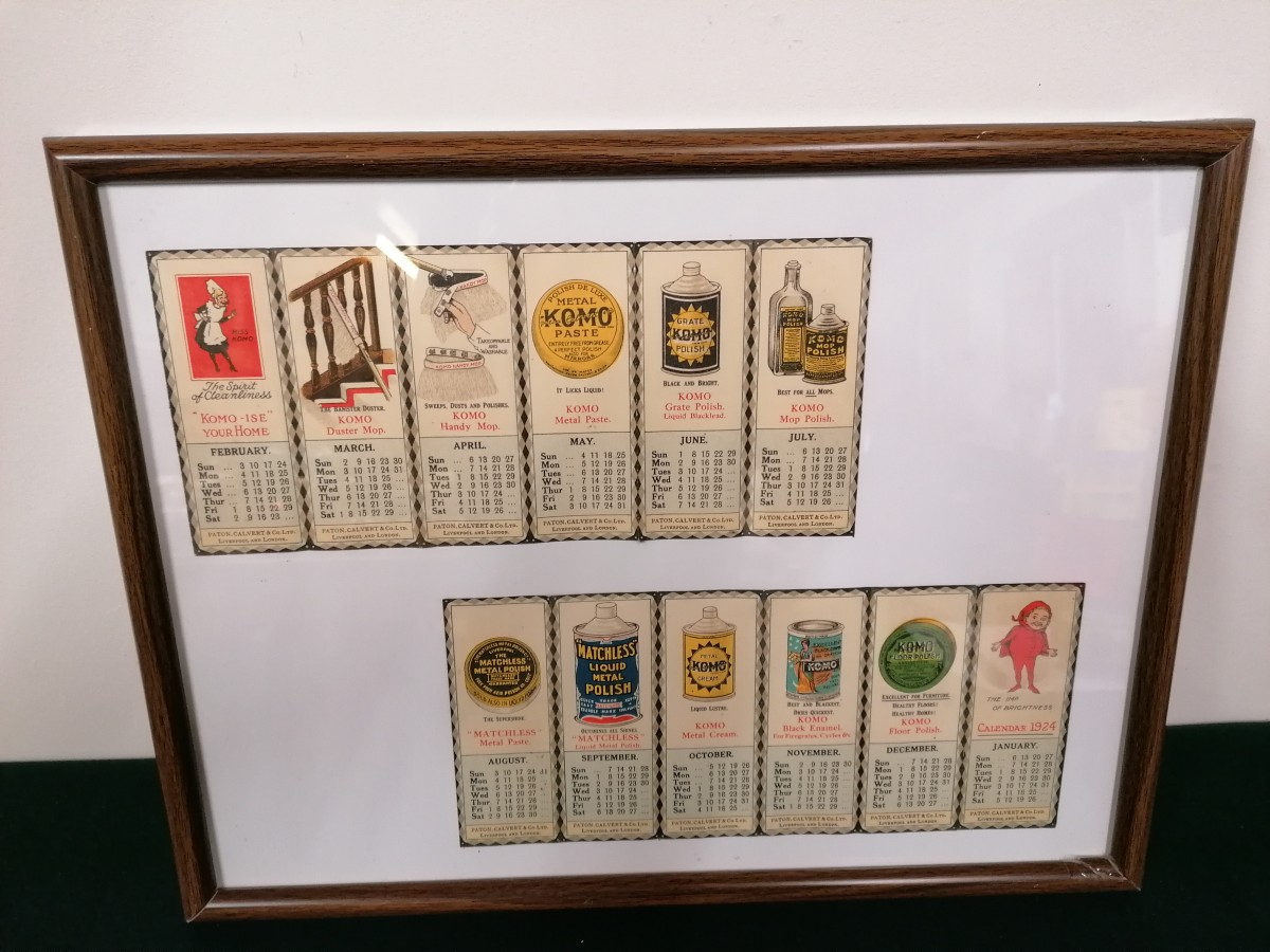 This item is two advertising trade cards, mounted to show the twelve calendar months during the year 1924,together with the various products in the Komo and Matchless range.