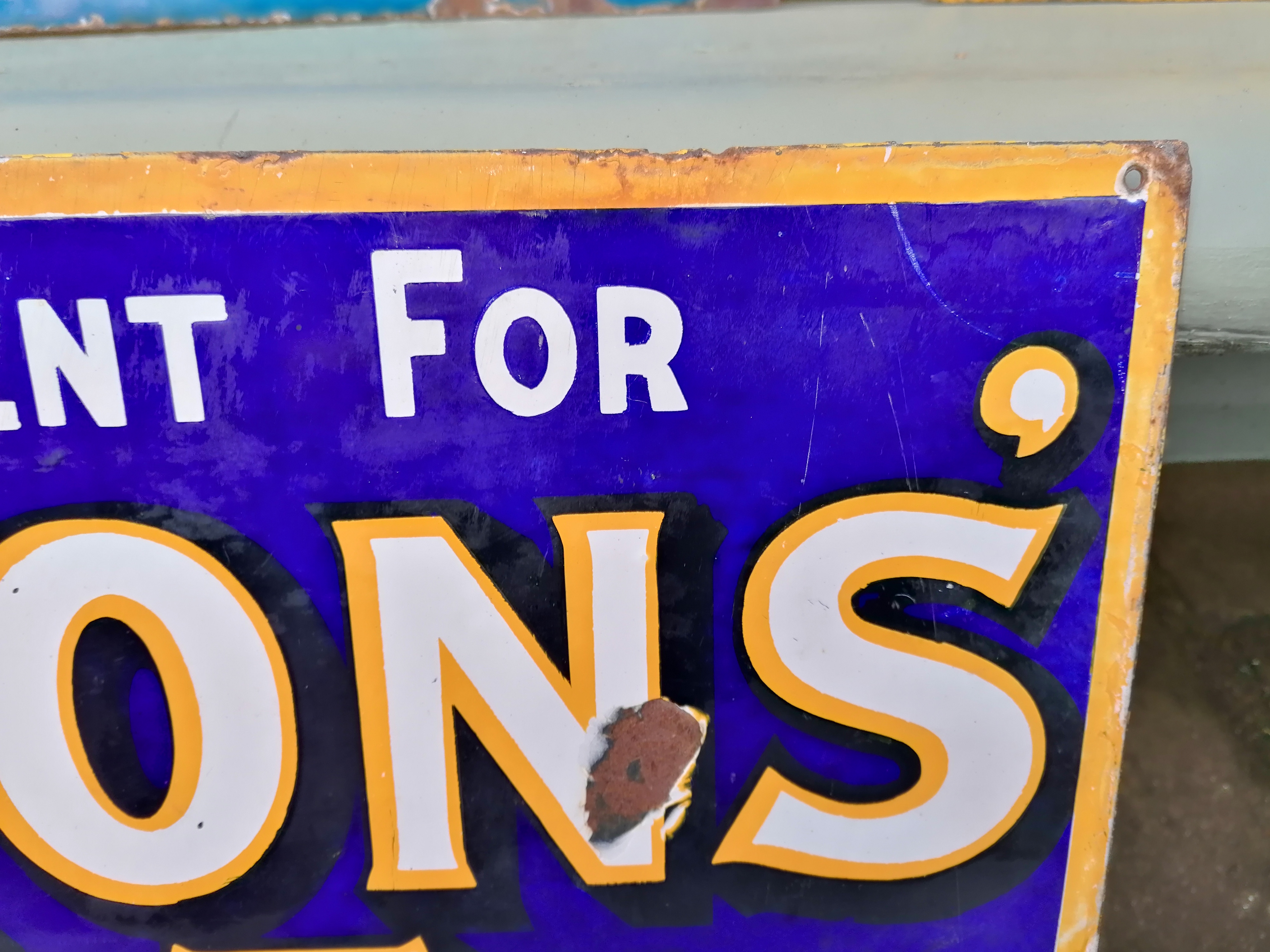 This vintage double sided former flange sign comes with age related wear and tear. It is missing its flange and some restoration has been carried out.